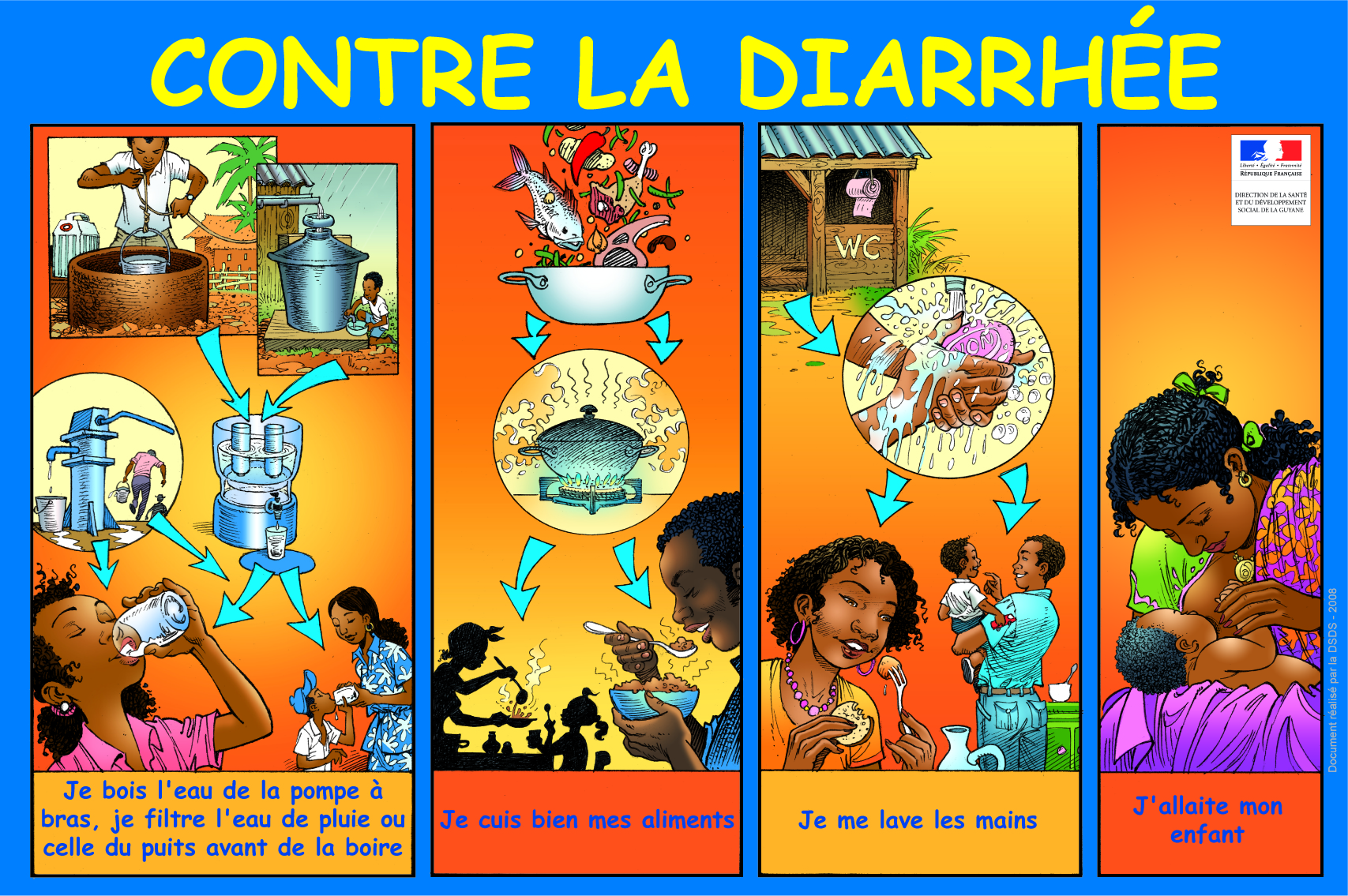 affiche, aide visuelle Jan 2006 ; 1 pages; format: 60cmx40cm Ed. ARS - Cayenne Téléchargeable sous format: dsds_guyane_affiche_lutte_contre_diarrhee_2009.jpg (2 590 ko) PdF Résumé: Cette affiche diffuse les 4 conseils suivants: -"purifier l'eau de boisson", -"bien cuire ses aliments", -"se laver les mains" et "préférer l'allaitement maternel des bébés". Ce message a été élaboré pour lutter avec succès contre une épidémie de choléra en 1992, puis de typhoïde en 2005.