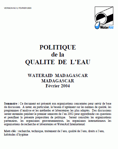 Document de réflexion visant à la mise en place d'une politique relative à l'étude et au contrôle de la qualité de l'eau à Madagascar. Sont décrits les rôles et importances des éléments chimiques dans l'eau, et les propositions de normes.
