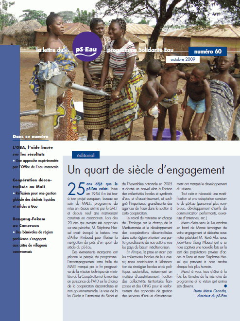 Un quart de siècle d'engagement lettre d'information coll. Lettre du pS-Eau n° 60 Oct 2009 ; 16 pages Ed. pS-Eau - Paris Téléchargeable sous format: PdF Sommaire: ----------------------------------------------------------------- EDITORIAL de PM. Grondin: Un quart de siècle d'engagement ----------------------------------------------------------------- p. 2 > Première conférence sur l'eau de l'Union pour la Méditerranée ----------------------------------------------------------------- EAU POTABLE ET ASSAINISSEMENT : ----------------------------------------------------------------- p. 3 > Madagascar: Mise en réseau des acteurs de l'eau Les collectivités territoriales et associations françaises sont de plus en plus nombreuses à s'investir à Madagascar sur les thèmes de l'eau et de l'assainissement. Nombre d'entre elles ignorent ce que font les autres ou éprouvent des difficultés à réunir les informations utiles au montage de leur projet. Le pS-Eau et l'ONG malgache CITE proposent un outil pour y remédier. p. 4 > Maroc: Une réflexion sur l'OBA (aide basée sur les résultats) L'Onep marocain face à la demande de raccordements individuels des ménages ruraux: Depuis le milieu des années 1990, le Maroc a réalisé d'importants progrès en termes d'accès à l'eau potable en milieu rural. Le réseau d'adduction d'eau par bornes-fontaines mis en place sur le territoire par l'Office national de l'eau potable, l'Onep, alimente une grande majorité de la population. Mais aujourd'hui, les ménages demandent des raccordements individuels. Pour résoudre le problème de rentabilité que cela pose en milieu rural, l'Onep expérimente une approche d'aide basée sur les résultats, l'OBA (Output-Based Aid). p. 7 > Mali: Coopération décentralisée pour l'assainissement à Gao Pour une approche globale des rejets liquides et solides Les initiateurs des projets d'assainissement au Mali ont souvent considéré ce secteur de manière cloisonnée, intervenant tantôt sur les questions de gestion des ordures ménagères, tantôt sur les questions de gestion des eaux usées ou encore de gestion des eaux de pluies. Le projet d'assainissement actuellement en cours dans la commune de Gao, avec la ville de Maxéville et le NanCIe, initie une approche globale pour obtenir un impact optimal et durable en matière de santé publique et d'environnement urbain. p. 10 > Cameroun: Hydraulique villageoise à Bangang Fokam Depuis 2008, grâce au soutien de partenaires français, l'association Lumière du monde* relève le défi au côté des populations et des autorités de Bangang-Fokam. Objectif : 22 puits pour alimenter la commune en eau potable de façon pérenne. Retour sur les étapes d'un engagement en phase d'être tenu. p. 11 > Le conseil général des Yvelines et la solidarité internationale ----------------------------------------------------------------- 3_ INFOS LECTURES ----------------------------------------------------------------- - Rainwater Harvesting - Voyage en Afrique urbaine - Construire un service public d'eau potable avec les entrepreneurs locaux. L'exemple du programme Mirep au Cambodge - Water Operators Partnerships – Africa Utility Performance Assessment - Guide de l'eau 2009-2010 - Guide pratique pour entreprendre en Côte d'Ivoire - Manuel de Gestion Intégrée des Ressources en Eau par Bassin - Les projets productifs au Mali et le rôle des associations de migrants en France - Appliquer les principes de l'OBA aux services d'eau et d'assainissement - Promising management models of rural water supply - Rapport mondial des Nations unies sur la mise en valeur des ressources en eau - Livre Bleu Bénin. L'eau la vie, le développement humain - Surveillance de l'environnement en Afrique pour le développement durable - En vie d'oasis, découverte de mondes et modes de vie menacés