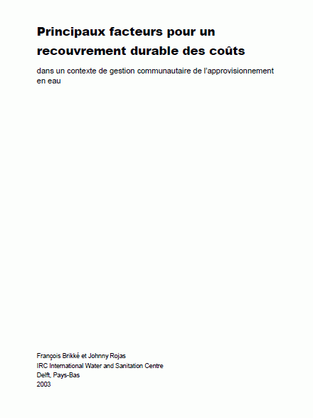 dans un contexte de gestion communautaire de l'approvisionnement en eau rapport Jan 2003 ; 110 pages Aut. François Brikké & Johnny Rojas Ed. IRC - Den Haag Téléchargeable sous format: PdF Téléchargeable chez l'éditeur Page de présentation d'un éditeur Résumé: Le recouvrement durable des coûts dépend d'un ensemble de facteurs comprenant la tarification, la conception d'une stratégie appropriée, l'application de principes de gestion sains, l'optimisation des coûts et la promotion de la volonté à payer. Ce document étudie en détail tous ces facteurs et offre - quand c'est possible - exemples et exercices. Publics-Cibles: