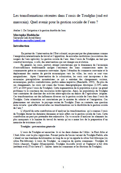 article Jan 2011 ; 10 pages Aut. Mustapha Haddache Ed. LPED - Marseille Téléchargeable sous format: PdF Téléchargeable chez l'éditeur Résumé: L’oasis de Toudgha appartient aux régions présahariennes. Elle se caractérise par la rareté des ressources hydrauliques et la rareté des terres agricoles. Devant ce milieu peu clément, les populations oasiennes de Toudgha ont su faire face à la rareté de ces deux facteurs économiques ; considérés comme les deux facteurs de production les plus déterminants dans l’oasis. Dans cette oasis, la gestion sociale de l’eau peut être considérée comme le résultat de confrontation de l’homme avec un milieu naturel peu clément. Cette pratique ancestrale a fonctionné pendant plusieurs siècles et continue de fonctionner à nos jours. Cependant, cette gestion sociale de l’eau est influencée par un ensemble de transformations. L’ouverture de l’oasis sur le monde extérieur, l’intervention coloniale, l’émigration internationale de travail et la disparition du climat d’insécurité qui régnait à la période de siba (période connue par l’autonomie des régions périphériques du Maroc) sont des faits marquants qui nous amènent à s’interroger sur le futur de la gestion sociale de l’eau dans cette oasis. Public-Cible: