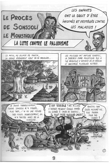 The Trial of Sonssoli, the Mosquito Je suis un enfant, mais j’ai aussi mes droits ! Malaria - Paludisme film vidéo Jan 2001 ; 7 pages Aut. Mimi Brazeau Ed. Plan International - Hamburg Téléchargeable sous format: PdF Téléchargeable chez l'éditeur Résumé: Je suis un enfant, mais j’ai aussi mes droits ! est une campagne de sensibilisation sur les droits de l’enfant initiée et menée par Plan et diffusée sur les stations de radio de sept pays de l’Afrique de l’Ouest. La campagne est axée sur l’application des droits de l’enfant dans leur propre milieu familial – non seulement en identifiant les problèmes, mais aussi en proposant des solutions pratiques. Des sketches sont utilisés pour expliquer et illustrer les droits de l’enfant. La campagne explore le concept de divertissement éducatif et fait participer les enfants à toutes les étapes, de la production à la diffusion. Resumen: Ein Comic auf französisch aus Guinea (Westafrika) erzählt die Geschichte, wie das Dorf Panzia die Moskito-Dame Sonssoli vertreibt und sich so vor Malaria schützt.