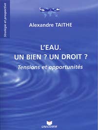 Tensions et opportunités livre Nov 2008 ; 214 pages ; prix indicatif: 21€ Aut. Alexandre Taithe Ed. Unicomm - Paris Page de présentation d'un éditeur Résumé: L’eau, dans des pays où les effets de la pénurie sont le plus criant, devient un facteur d’instabilité sociale et politique (précarisation dans les campagnes, effets sur l’exode rural, sur la santé des populations, multiplication de conflits entre utilisateurs et entre catégories d’usagers, différends transfrontaliers…). A cela s’ajoutent, à l’occasion de conflits locaux ou de débats internationaux, d’intenses questionnements d’ordre éthique et économique, qui portent sur l’opportunité de la participation du privé à la fourniture de services essentiels, sur la gratuité (virtuelle…) de l’eau, sa commercialisation, sur la reconnaissance d’un droit de l’homme à l’eau. Cependant, ces enjeux ne découleraient-ils pas d’un même phénomène : l’affirmation croissante de la dimension économique de l’eau ? Si le caractère économique de la ressource s’intensifie, celui-ci n’est qu’une composante de l’eau, parallèlement à ses dimensions sociale et environnementale. Un nouvel équilibre entre les différentes valeurs de l’eau reste alors à trouver. Car au-delà de défis concrets (sanitaire, alimentaire…) et de solutions techniques, il s’agit de redéfinir les compromis sociaux qui permettront une gestion durable, et perçue comme équitable, de la ressource.