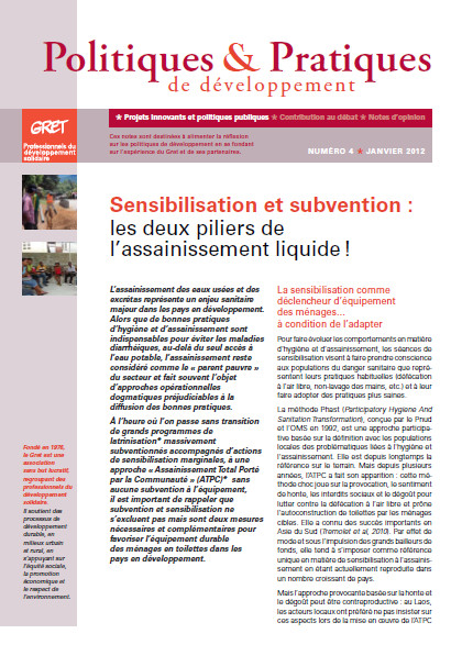 note coll. Politiques & Pratiques de développement n° 4 Jan 2012 ; 4 pages Aut. Julien Gabert Ed. GRET - Nogent sur Marne ; Issn: 2119-8683 Téléchargeable sous format: PdF Téléchargeable chez l'éditeur Page de présentation d'un éditeur Résumé: L’assainissement des eaux usées et des excrétas représente un enjeu sanitaire majeur dans les pays en développement. Alors que de bonnes pratiques d’hygiène et d’assainissement sont indispensables pour éviter les maladies diarrhéiques, au-delà du seul accès à l’eau potable, l’assainissement reste considéré comme le « parent pauvre » du secteur et fait souvent l’objet d’approches opérationnelles dogmatiques préjudiciables à la diffusion des bonnes pratiques. À l’heure où l’on passe sans transition de grands programmes de latrinisation* massivement subventionnés accompagnés d’actions de sensibilisation marginales, à une approche « Assainissement Total Porté par la Communauté » (ATPC)* sans aucune subvention à l’équipement, il est important de rappeler que subvention et sensibilisation ne s’excluent pas mais sont deux mesures nécessaires et complémentaires pour favoriser l’équipement durable des ménages en toilettes dans les pays en développement.