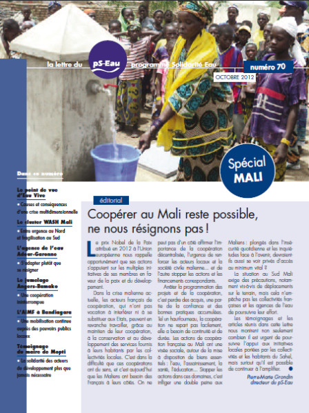 Coopérer au Mali reste possible, ne nous résignons pas ! lettre d'information coll. Lettre du pS-Eau n° 70 Oct 2012 ; 16 pages Ed. pS-Eau - Paris Téléchargeable sous format: PdF Sommaire: EDITORIAL: p. 1: Coopérer au Mali reste possible, ne nous résignons pas! Auteur: Pierre-Marie Grondin p. 2: Mali: Un dispositif de suivi et d’appui renforcé aux acteurs de développement Auteur: Guillaume Aubourg p. 3: Le point de vue d’Eau Vive: Orienter la coopération vers l’appui à la gouvernance locale Eclairage sur une crise multimensionnelle Depuis mars 2012, le Mali a sombré dans une crise sociopolitique, sécuritaire et humanitaire sans précédent. Un pays coupé en deux, un Etat désagrégé, des milliers de personnes déplacées vers le sud et les pays voisins, une nation qui doute de sa propre existence et de son identité avec l’absurde opposition d’un Sud fertile à un Nord problématique. Les causes les plus apparentes masquent des raisons plus anciennes et profondes auxquelles il importe plus que jamais et de façon urgente d’apporter des réponses. Auteurs: Virginie Bineau & Jean-Bosco Bazié p. 5: Les programmes reposent désormais sur les acteurs locaux, qui ont besoin de moyens. ¬Interview de Alassan Nahé, directeur d’Eau Vive Mali Interview réalisé par Virginie Bineau, directrice du développement à Eau Vive Auteur: Alassan Nahé p. 7: Le Mali a plus que jamais besoin de solidarités Interview de Julie Gauthier, coordinatrice du cluster WASH Mali Créés par les Nations unies, les clusters sont des cellules de coordination de l’ensemble des intervenants sur une problématique donnée dans des pays souffrant de crise humanitaire. Julie Gauthier est coordinatrice du cluster WASH1 mis en place au Mali en avril 2012. Son témoignage souligne combien le retrait des acteurs de la coopération serait dommageable aux populations maliennes, notamment celles qui souffrent de manière endémique de malnutrition, au Nord comme au Sud. Auteur: Julie Gauthier p. 8: Zoom sur le cluster WASH: Une coordination des interventions d’urgence pour l’eau et l’assainissement Le système de "cluster" des Nations Unies est un des piliers de la réforme humanitaire de 2005 visant à améliorer l'efficacité et la qualité des interventions d'urgence en assurant la coordination de tous les acteurs. Auteur: Julie Gauthier p. 9: Interview d’Alain Dutemps, de l’agence de l’eau Adour-Garonne: S’adapter plutôt que se résigner Alain Dutemps, conseiller Relations internationales et coopération décentralisée auprès du directeur général, explique comment l'agence de l’eau Adour-Garonne agit au cas par cas pour soutenir le mieux possible ses partenaires intervenant au Mali, tout en veillant à ne pas risquer leur sécurité. Auteur: Alain Dutemps p. 10: Le succès d’un jumelage: Une coopération ininterrompue malgré le contexte Depuis plus de trente ans, Angers et son agglomération entretiennent des relations privilégiées de jumelage avec le district de Bamako. Cette coopération historique mobilise aussi bien les autorités et services techniques des deux localités que leurs acteurs associatifs et socioprofessionnels. Malgré les contraintes liées au conflit touchant le Mali, ce partenariat solide s’adapte et poursuit ses activités. Auteurs: Olivier Despretz & Seydou Coulibaly & Oumar Konaté p. 12: Message de Pierre Baillet: L’AIMF s’engage à renforcer les pouvoirs publics maliens confrontés à la crise Auteur: Pierre Baillet p. 13: L’AIMF à Bandiagara: Mobilisation continue pour l’accès durable à l’eau Pour assurer une meilleure couverture des besoins et contribuer à une gestion améliorée du service de l’eau, depuis 2010 la municipalité de Bandiagara développe avec l’Association internationale des maires francophones (AIMF) un programme d’interventions pluriannuel soutenu par l’agence de l’eau Rhin-Meuse et la Principauté de Monaco. Auteur: Arianna Ardesi p. 14: L’afflux des populations quittant le Nord entraîne un accroissement de la pauvreté Interview de Monsieur Oumar Bathily, maire de Mopti Depuis de nombreuses années, des ONG et des collectivités territoriales participent au développement de Mopti et d’autres communes rurales et urbaines de la région. La plupart de ces partenaires ont suspendu leurs activités, laissant la place oux organisations humanitaires. Auteurs: Oumar Bathily & Didier Ouédraogo p. 16: Fonds de solidarité des collectivités françaises pour le Mali et le Sahel Appel à la solidarité des collectivités françaises (adhérentes ou non à Cités Unies France), et à leurs associations, envers les collectivités territoriales du Mali et des pays sahéliens voisins, affectés par la crise malienne. Auteur: Constance Koukoui