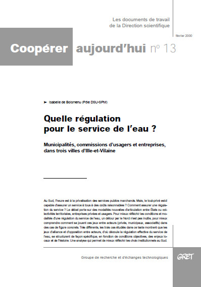 rapport coll. Coopérer aujourd'hui n° 13 Feb 2000 ; 41 pages Aut. Isabelle de Boismenu Ed. GRET - Nogent sur Marne ; Isbn: 978-2-86844-201-7 Téléchargeable sous format: PdF Téléchargeable chez l'éditeur Page de présentation d'un éditeur Résumé: Au Sud, l'heure est à la privatisation des services publics marchands. Mais le tout-privé est-il capable d'assurer un service à tous à des coûts raisonnables ? Comment assurer une régulation du service ? Le débat porte sur des modalités nouvelles d'articulation entre Etats ou collectivités territoriales, entreprises privées et usagers. Pour mieux réfléchir les conditions et modalités d'une régulation du service de l'eau, un détour par le Nord n'est pas inutile, pour mieux comprendre comment se jouent ces jeux entre acteurs (privés, municipaux, associatifs) dans des cas de figure concrets. Très différents, les trois cas étudiés dans ce texte montrent que les jeux d'alliance et d'opposition entre acteurs, d'où découle la régulation effective du service de l'eau, se structurent de façon spécifique, en fonction de conditions objectives, des enjeux locaux et de l'histoire. Une analyse qui permet de mieux réfléchir les choix institutionnels au Sud.