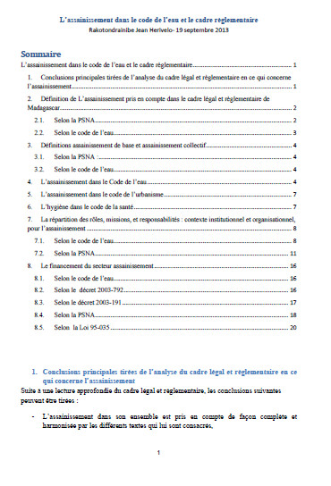 dossier, étude Sep 2013 ; 21 pages Aut. Jean Herivelo Rakotondrainibe Ed. Diorano WASH - Antananarivo Téléchargeable sous format: PdF Sommaire: L’assainissement dans le code de l’eau et le cadre règlementaire . 1 1. Conclusions principales tirées de l’analyse du cadre légal et règlementaire en ce qui concerne l’assainissement . 1 2. Définition de L’assainissement pris en compte dans le cadre légal et règlementaire de Madagascar . 2 2.1. Selon la PSNA . 2 2.2. Selon le code de l’eau . 3 3. Définitions assainissement de base et assainissement collectif . 4 3.1. Selon la PSNA : . 4 3.2. Selon le code de l’eau . 4 4. L’assainissement dans le Code de l’eau . 4 5. L’assainissement dans le code de l’urbanisme . 7 6. L’hygiène dans le code de la santé . 7 7. La répartition des rôles, missions, et responsabilités : contexte institutionnel et organisationnel, pour l’assainissement . 8 7.1. Selon le code de l’eau . 8 7.2. Selon la PSNA . 11 8. Le financement du secteur assainissement . 16 8.1. Selon le code de l’eau . 16 8.2. Selon le décret 2003-792 . 16 8.3. Selon le décret 2003-191 . 17 8.4. Selon la PSNA . 18 8.5. Selon la Loi 95-035 . 20 Publics-Cibles: Collectivité , Association , Tout public , Université , Animateur/Educateur , Acteurs de coopération , Technicien , Décideurs locaux ou nationaux , Santé (professionnels de la)