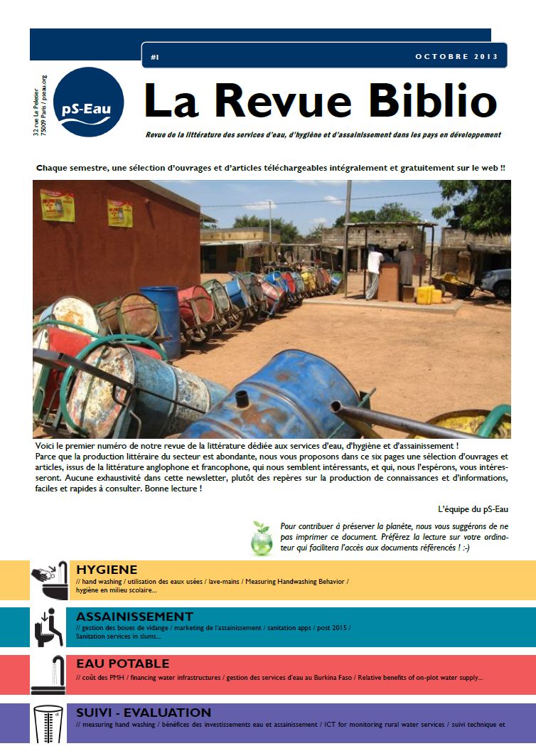 Ressources, la revue biblio du pS-Eau Resources #1 revue coll. Ressources n° 1 Oct 2013 ; 6 pages Aut. Ed. pS-Eau - Paris Téléchargeable sous format: PdF Résumé: Ressources est la revue biblio du pS-Eau sur l'eau, l'assainissement et l'hygiène.