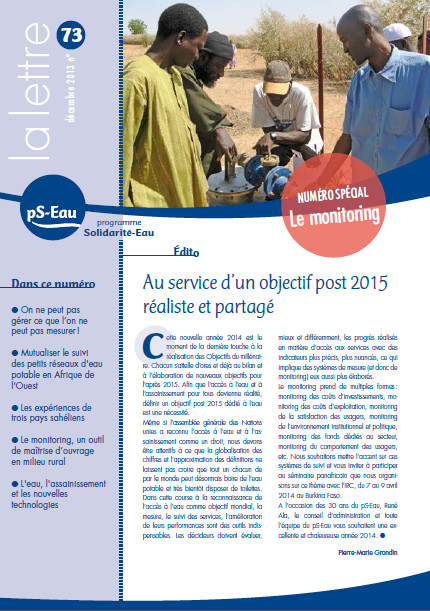 Au service d’un objectif post 2015 réaliste et partagé lettre d'information coll. Lettre du pS-Eau n° 73 Dec 2013 ; 16 pages Ed. pS-Eau - Paris Téléchargeable sous format: PdF Sommaire: 3 Le monitoring, une démarche indispensable On ne peut pas gérer ce que l’on ne peut pas mesurer ! 5 Les petits réseaux d’eau potable en Afrique de l’Ouest Mutualiser le suivi pour une meilleure rentabilité 7 Retour d'expériences dans trois pays sahéliens Le monitoring des petites adductions d'eau 9 Une initiative de l'IRC au Burkina Faso Le monitoring, un outil de maîtrise d’ouvrage pour les communes rurales 11 L'eau, l'assainissement et les nouvelles technologies Téléphonie et Internet, une révolution à venir ? 13 Autres expériences de monitoring La performance des services : une notion qui progresse 15 Les infos pS-Eau