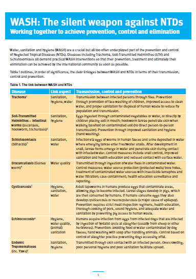 Working together to achieve prevention, control and elimination livret Oct 2012 ; 15 pages Aut. Yael Velleman & Ed. WaterAid - London Téléchargeable sous format: PdF Téléchargeable chez l'éditeur Abstract: Water, sanitation and hygiene (WASH) are a crucial but all too often underplayed part of the prevention and control of Neglected Tropical Diseases (NTDs). Diseases including Trachoma, Soil-Transmitted Helminthes (STH) and Schistosomiasis all demand practical WASH interventions so that their prevention, treatment and ultimately their elimination can be achieved by the international community as soon as possible. This document focuses on the link between WASH and NTDs.