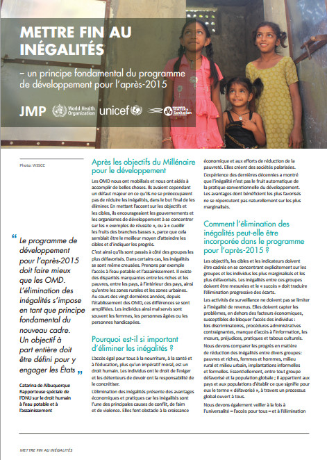 Ending inequalities, a cornerstone of the post-2015 development agenda A cabar con las desigualdades– Eje de la agenda para el desarrollo después de 2015 plaquette Oct 2013 ; 2 pages Ed. WHO - Genève Téléchargeable sous format: PdF Téléchargeable chez l'éditeur Page de présentation d'un éditeur Résumé: Agenda sur les nouveaux objectifs de developpement durable pour l’eau et l’assainissement pour apres-2015