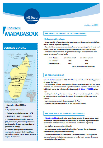 note coll. Fiche-Pays Nov 2024 ; 3 pages Aut. Liana Rajaonary Ed. pS-Eau - Paris Téléchargeable sous format: PdF Résumé: Synthèse des informations clés sur le secteur de l'eau et de l'assainissement à Madagascar : taux d'accès, problématiques principales, cadres législatif et réglementaire, acteurs institutionnels, modes de gestion des services, documentation de référence, contacts, etc.