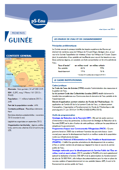 Synthèse des informations clés sur le secteur de l'eau et de l'assainissement en Guinée : taux d'accès, problématiques principales, cadres législatif et réglementaire, acteurs institutionnels, modes de gestion des services, documentation de référence, contacts, etc.