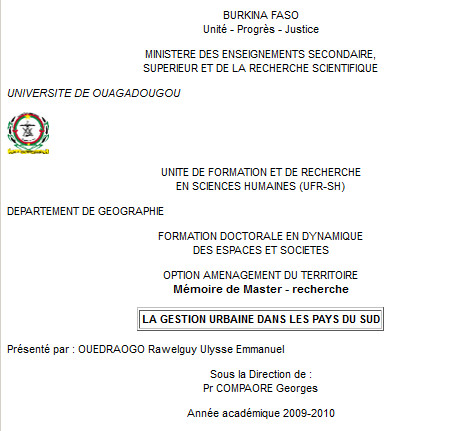rapport Jan 2010 Aut. Rawelguy Ulysse Emmanuel Ouedraogo Ed. Université de Ouagadougou - Joseph Ki Zerbo - Ouagadougou Page de présentation d'un éditeur Résumé: La présente étude vise à analyser les modalités de la gestion urbaine en privilégiant l'étude des difficultés liées à la gestion des déchets urbains dans les pays du Sud. La méthodologie a consisté à faire une recherche documentaire, à définir le cadre conceptuel, à présenter et discuter la revue de littérature. Il ressort de l'étude que la gestion de la ville consiste à améliorer les infrastructures et les services urbains afin d'accroitre le développement de la ville et d'améliorer les conditions de vie des citadins. Elle couvre plusieurs aspects dont la gestion de l'espace urbain, la gestion économique, la gestion administrative, la gestion des équipements ou infrastructures et enfin la gestion des déchets. La gestion environnementale est importante car elle permet de résoudre les problèmes de pollution du cadre de vie et de préserver les ressources pour les générations futures. Le changement des perceptions sur le déchet a entraîné la définition des nouvelles politiques de gestion globale des déchets adaptées aux exigences du site urbain. La gestion des déchets commence alors par la collecte et se termine par la valorisation en passant par les étapes de transport et de traitement des fractions non valorisables. Sommaire: Chapitre 1 : La position du problème Chapitre 2 : La méthodologie de l'étude Chapitre 3 : Modes et outils de la gestion urbaine Chapitre 4 : Gestion environnementale et gestion des déchets urbains Conclusion
