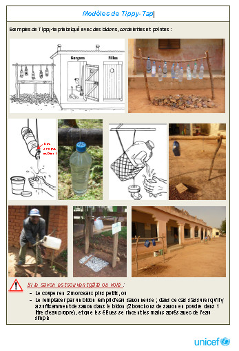 Exemples de Tippy-tap (réservoirs basculants, d'eau pour le lavage des mains) fabriqués avec des bidons, cordelettes et pointes. Notez que la bascule est assurée avec une pédale à pied, afin de ne pas se re-contaminer les mains.