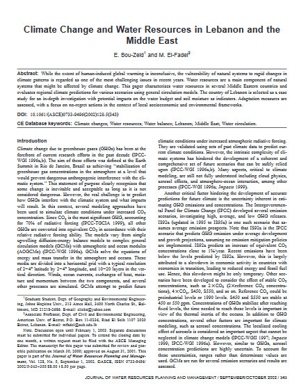 Changement climatique et ressource en eau au Liban et au Moyen-Orient article Aug 2002 ; 13 pages Aut. Elie Bou-Zeid & Mutasem El-Fadel Ed. ASCE - Reston Téléchargeable chez l'éditeur Page de présentation d'un éditeur Résumé: Bien qu’il soit difficile de mesurer l’ampleur du changement climatique induit par l’Homme, la vulnérabilité des systèmes naturels à des changements rapides dans les modèles climatiques est considérée comme l'un des problèmes majeurs de ces dernières années. Les ressources en eau sont une composante principale du système naturel qui pourrait être affecté par le changement climatique. Ce document décrit les ressources en eau dans plusieurs pays du Moyen-Orient et évalue les prévisions climatiques régionales avec différents scénarios en utilisant des modèles de circulation générale. Le Liban fait l’objet d’une étude approfondie afin de mesurer les impacts potentiels sur le budget de l'eau et l'humidité du sol comme indicateurs. Les mesures d'adaptation sont évaluées, sous le prisme d’une analyse a posteriori des actions dans leur contexte socioéconomique et environnemental local. Abstract: While the extent of human-induced global warming is inconclusive, the vulnerability of natural systems to rapid changes in climate patterns is regarded as one of the most challenging issues in recent years. Water resources are a main component of natural systems that might be affected by climate change. This paper characterizes water resources in several Middle Eastern countries and evaluates regional climate predictions for various scenarios using general circulation models. The country of Lebanon is selected as a case study for an in-depth investigation with potential impacts on the water budget and soil moisture as indicators. Adaptation measures are assessed, with a focus on no-regret actions in the context of local socioeconomic and environmental frameworks. Public-Cible: