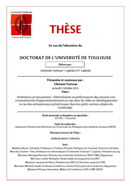 Institutions and transactions: Determinants and performances of alternative water supply services in developing cities. The case of local private entrepreneurs in small urban centers of Cambodia thèse Oct 2016 ; 454 pages Aut. Ed. Université de Toulouse 1 - Toulouse Téléchargeable sous format: PdF Résumé: Petits opérateurs privés, vendeurs d’eau informels, fournisseurs non-étatiques… de nouveaux acteurs participent à la gouvernance des services d’approvisionnement en eau potable des villes en développement. Longtemps ignorés, ils connaissent aujourd’hui un intérêt croissant de la part de la communauté internationale car ils questionnent les modalités de gouvernance des services en réseaux au Sud. Hétérogènes et composites, d’origine locale, adaptés aux demandes des usagers, les services non conventionnels disposeraient d’une grande flexibilité convenant à l’environnement particulier des villes en développement. Ils seraient également en mesure d’apporter de nouveaux financements et d’assurer une pérennité du service à plus ou moins long terme. Or, peu de travaux théoriques en sciences économiques ont été entrepris sur cet objet de recherche. Nous le confirmerons à l’aide d’une analyse bibliométrique inédite. Cette thèse a donc pour objectif de combler ce manque, dans ses dimensions théoriques et empiriques. Adoptant une posture critique, elle s’emploie à discuter les postulats et les hypothèses d’efficience non-vérifiées de ce mode de coordination des acteurs. Par la suite, elle mobilise les concepts issus de la Nouvelle Economie Institutionnelle, proposant une grille de lecture originale des déterminants et de l’efficience des services non conventionnels. Grâce à une enquête de terrain approfondie conduite au Cambodge, nous critiquons le « caractère » concurrentiel qui fonde à priori ce(s) mode(s) de gouvernance. Nous montrons plutôt l’impact des coûts de transaction sur les arrangements organisationnels liés aux conditions d’accès à la ressource en eau. Au-delà de la rhétorique sur l’efficience des agents privés, nous soulignons également l’importance de considérer les arrangements organisationnels non-sectoriels. Nous apportons enfin des éclairages sur le rôle joué par les normes informelles dans la réduction des incertitudes de l’environnement institutionnel. Nous concluons toutefois sur les difficultés potentielles d’institutionnalisation de ce(s) mode(s) de gouvernance car verrouillé dans un sentier de dépendance institutionnel. Abstract: Small-scale private operators, informal water vendors, non-state providers… new stakeholders are participating in water supply governance in developing cities. Previously ignored, they are today drawing growing attention from the international community as they question the governance modalities of network industries in the Global South. Heterogeneous and composite, of local origin, adapted to the demands of end-users, alternative services would be highly flexible, thus adapted to the particular environment of developing cities. They also would be able to provide new funds and to ensure sustainability of water supply services in long or shorter term. However, there is little theoretical research in economics undertaken on this topic. We are confirming this through an unpublished bibliometric analysis. This PhD aims consequently to provide theoretical and empirical elements to fill this gap. Adopting a critical stance, it intends to highlight the postulates and unconfirmed efficiency assumptions of this particular governance structure. Thereafter, it mobilizes New Institutional Economics concepts, offering an original analytical framework on the determinants and efficiency of alternatives services. Through an extensive field survey conducted in Cambodia, we criticize the competitive character of this type of governance which is a priori supposed to ground it. We show the impact of transaction costs on the organizational arrangements related to the conditions of water resource access. Beyond the rhetoric of private sector efficiency, we also stress the importance to take into account non-sectoral organizational arrangements. We finally underline the key role of informal norms in reducing the uncertainties of the institutional environment. We nevertheless conclude on the potential difficulties to institutionalize this(hose) governance(s) structure(s) as they are locked in an institutional path-dependence. Publics-Cibles: