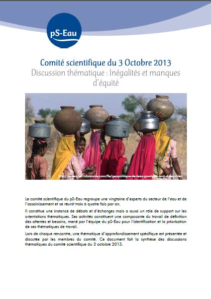 Comité scientifique du pS-Eau du 3 Octobre 2013 rapport Oct 2013 ; 8 pages Ed. pS-Eau - Paris Téléchargeable sous format: PdF Page de présentation d'un éditeur Résumé: Le comité scientifique du pS-Eau regroupe une vingtaine d’experts du secteur de l’eau et de l’assainissement et se réunit trois à quatre fois par an. Il constitue une instance de débats et d’échanges mais a aussi un rôle de support sur les orientations thématiques. Ses activités constituent une composante du travail de définition des attentes et besoins, mené par l’équipe du pS-Eau pour l’identification et la priorisation de ses thématiques de travail. Lors de chaque réunion, une thématique d'approfondissement est présentée et débattue par les membres du comité. Public-Cible: