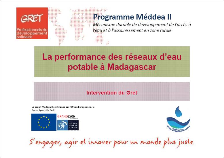 Partage d'expérience du Gret diaporama powerpoint Oct 2016 ; 7 pages Ed. GRET - Antananarivo Téléchargeable sous format: PdF Résumé: Présentation faite par l'ONG Gret lors de la rencontre d'échanges du réseau Ran'Eau sur la performance des réseaux d'EP à Antananarivo les 27 et 28 Octobre 2016. Publics-Cibles: Collectivité , Acteurs de coopération , Décideurs locaux ou nationaux