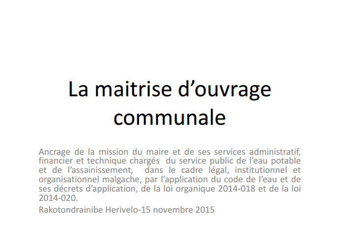 guide Nov 2015 ; 30 pages Aut. Jean Herivelo Rakotondrainibe Ed. Diorano WASH - Antananarivo Téléchargeable sous format: PdF Résumé: La maîtrise d'ouvrage communale et les responsabilités des communes à Madagascar Publics-Cibles: Collectivité , Association , Acteurs de coopération , Décideurs locaux ou nationaux