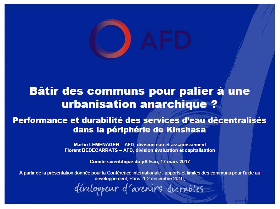 Présentation thématique du comité scientifique : Bâtir des communs pour palier à une urbanisation anarchique ? Performance et durabilité des services d'eau décentralisés dans la périphérie de Kinshasa | ||||||||