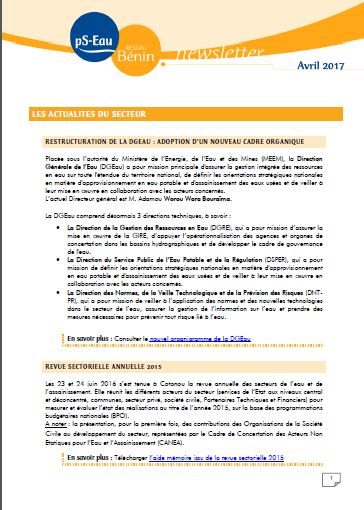 lettre d'information Apr 2017 ; 6 pages Aut. Philippe Mouton Ed. pS-Eau - Paris Téléchargeable sous format: PdF Résumé: Cette newsletter fournit des informations sur les actualités du secteur de l'eau et de l'assainissement au Bénin, et donne un aperçu des nouveaux projets de coopération décentralisée initiés entre des collectivités françaises et béninoises. Publics-Cibles: Collectivité , Association , Acteurs de coopération , Migrant