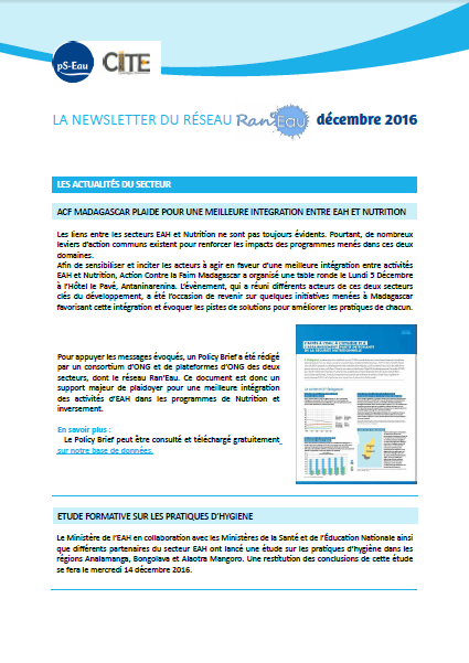 lettre d'information coll. Newsletter du Ran'Eau n° 201612 Dec 2016 Ed. CITE - Antananarivo pS-Eau - Paris Ran'Eau - Antananarivo Téléchargeable chez l'éditeur Résumé: Lettre d'informations du réseau Ran'Eau