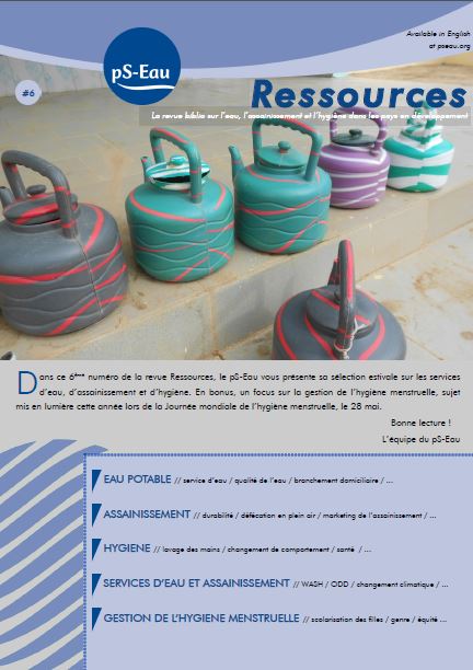 Ressources, la revue biblio du pS-Eau lettre d'information coll. Ressources n° 6 Jul 2017 ; 7 pages Aut. Colette Génevaux Ed. pS-Eau - Paris Téléchargeable sous format: PdF Page de présentation d'un éditeur Résumé: Dans ce 6ème numéro de la revue Ressources, le pS-Eau vous présente sa sélection estivale sur les services d’eau, d’assainissement et d’hygiène. En bonus, un focus sur la gestion de l’hygiène menstruelle, sujet mis en lumière cette année lors de la Journée mondiale de l’hygiène menstruelle, le 28 mai. Abstract: In this 6th review, you’ll find our summer selection on recent WASH literature. In this edition, we’ve added a focus on menstrual hygiene management, as Menstrual Hygiene Day was celebrated recently on the 28th May. Enjoy your reading! Publics-Cibles:
