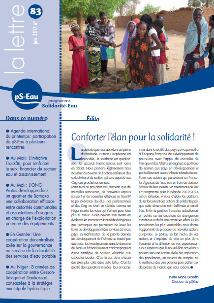 Conforter l’élan pour la solidarité ! Conforter l’élan pour la solidarité ! lettre d'information coll. Lettre du pS-Eau n° 83 Jun 2017 ; 16 pages Ed. pS-Eau - Paris Téléchargeable sous format: PdF Sommaire: • Agenda international du printemps : participation du pS-Eau à plusieurs rencontres • Au Mali : L’initiative Trackfin, pour renforcer le suivi financier du secteur eau et assainissement • Au Mali : L’ONG Protos développe dans un quartier de Bamako une collaboration efficace entre autorités communales et associations d’usagers en charge de l’exploitation pérenne des équipements • En Guinée : Une coopération décentralisée axée sur la gouvernance au service de la durabilité des services d’eau potable • Au Niger : 8 années de coopération entre Cesson-Sévigné et Dankassari, consacrées à la stratégie municipale hydraulique