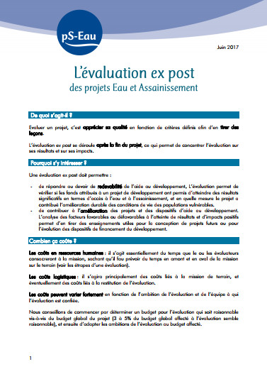 note coll. Fiche de synthèse Aug 2017 ; 4 pages Aut. Vincent Dussaux Ed. pS-Eau - Paris Téléchargeable sous format: PdF Résumé: Les évaluations ex post de projets sont de plus en plus fréquemment conseillées voire exigées, y compris pour les projets de "petite taille". Qu'est-ce que c'est ? En quoi est-ce utile ? Combien ça coûte ? Comment procéder ? Le pS-Eau répond aux questions que vous vous posez sur l'évaluation ex post dans cette fiche de synthèse. Publics-Cibles: