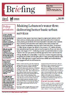 Lebanon’s urban spaces have been shaped by regional and national conflict. Basic services, including water provision, have long suffered from fractured urban planning and extensive informal urbanisation. Vulnerable urban residents rely on vendors, informal services and markets, when state provision and camp-focused humanitarian responses fail to meet their needs. The arrival of 1.5 million Syrian refugees has added to the pressure: UN-Habitat estimates that national demand on water services has increased by 28 per cent since the Syrian crisis began in 2011. Reflecting on water-focused interventions in urban Lebanon over a six-year period, we identify approaches that could increase the efficacy, flexibility and sustainability of responses: inclusive integrated planning; recognising the positive and disruptive power of data; partnership between state and non-state agencies to support autonomous utilities and local institutions; and engagement with the informal sector.