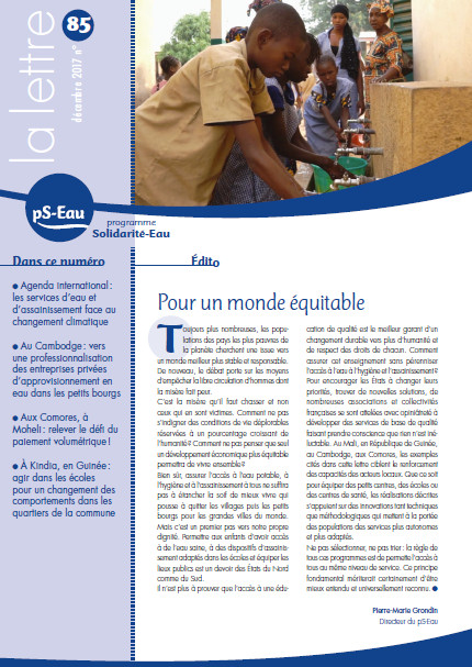 Pour un monde équitable lettre d'information coll. Lettre du pS-Eau n° 85 Dec 2017 ; 16 pages Ed. pS-Eau - Paris Téléchargeable sous format: PdF Sommaire: • Pour un monde équitable Pierre-Marie Grondin (Directeur du pS-Eau) Ps-Eau Association • Un nouveau départ… Ps-Eau Association • Travaux du comité scientifique • Les services d’eau et d’assainissement sous la menace du changement climatique Colette Génevaux • Au Cambodge: De l’innovation à la professionnalisation ! Alicia Tsitsikalis & Clément Frenoux & Mathieu Le Corre • À Moheli, aux Comores: Relever le défi du paiement volumétrique ! Nicolas Cadot (Initiative Développement (ID) ) • À Kindia, en Guinée: EduKindia Aurélie Cauwelier (Guinée 44)