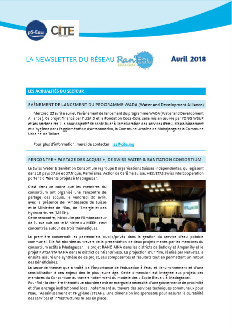 lettre d'information coll. Newsletter du Ran'Eau n° 201804 Apr 2018 ; 8 pages Ed. CITE - Antananarivo pS-Eau - Paris Ran'Eau - Antananarivo Téléchargeable sous format: PdF Résumé: Lettre d'information périodique du réseau Ran'Eau Public-Cible: