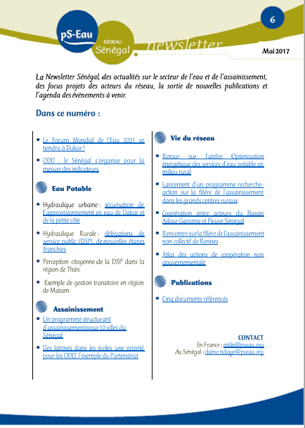 lettre d'information coll. Lettre Sénégal n° 201705 May 2017 ; 12 pages Aut. Ed. pS-Eau - Paris - 6 édition Téléchargeable sous format: PdF Résumé: Des informations sur l'actualité du secteur de l'eau et de l'assainissement au Sénégal et sur la vie du Réseau Sénégal du pS-Eau ! Publics-Cibles: Collectivité , Université , Acteurs de coopération , Socio-économiste , Décideurs locaux ou nationaux