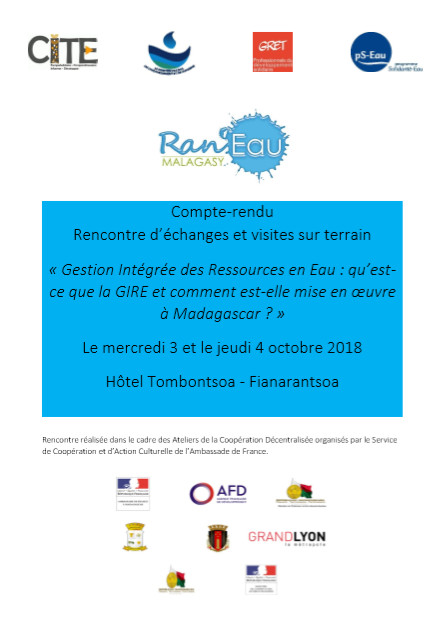 rapport Nov 2018 ; 20 pages Ed. CITE - Antananarivo pS-Eau - Paris Ran'Eau - Antananarivo Téléchargeable sous format: PdF Résumé: Comtpe rendu de la rencontre d'échanges et visites terrain sur la GIRE organisée par le réseau Ran'Eau le 3 et 4 octobre à Fianarantsoa. Publics-Cibles: Collectivité , Association , Acteurs de coopération , Technicien , Décideurs locaux ou nationaux