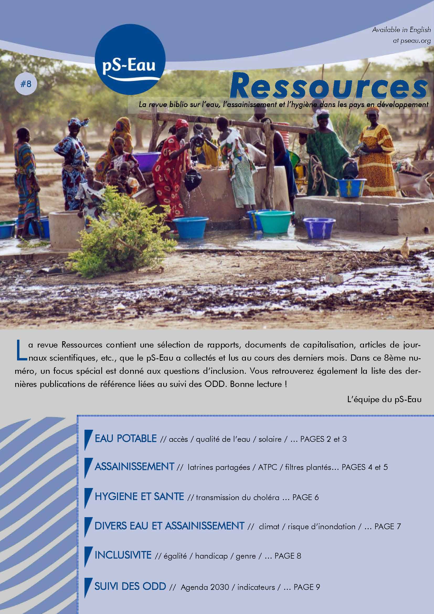 La revue Ressources contient une sélection de rapports, documents de capitalisation, articles de journaux scientifiques, etc., que le pS-Eau a collectés et lus au cours des derniers mois. Dans ce 8ème numéro, un focus spécial est donné aux questions d’inclusion. Vous retrouverez également la liste des dernières publications de référence liées au suivi des ODD.