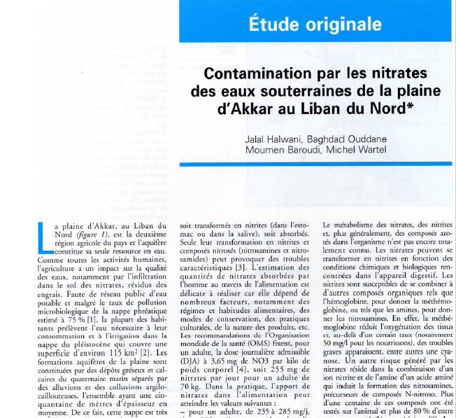 Contamination par les nitrates des eaux souterraines de la plaine d'Akkar au Liban du Nord thèse Jan 1999 ; 5 pages Ed. LU - Beirut Téléchargeable sous format: PdF