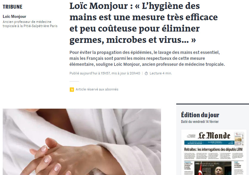 Pour éviter la propagation des épidémies, le lavage des mains est essentiel, mais les Français sont parmi les moins respectueux de cette mesure élémentaire, souligne Loïc Monjour, ancien professeur de médecine tropicale. article de presse Feb 2020 ; 3 pages Aut. Loïc Monjour Ed. Le Monde - Paris Téléchargeable sous format: PdF Téléchargeable chez l'éditeur