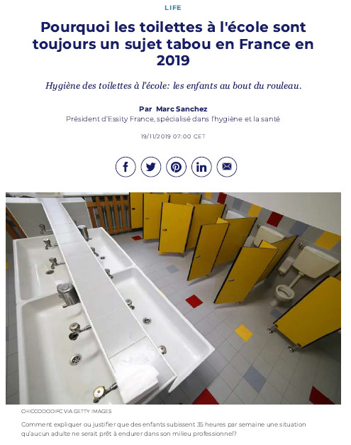 Hygiène des toilettes à l’école: les enfants au bout du rouleau. article de presse Nov 2019 ; 4 pages Aut. Marc Sanchez Ed. Huffington Post - Chicago Téléchargeable sous format: PdF Téléchargeable chez l'éditeur Résumé: En effet, nous pourrions penser que les écoles françaises disposent de tous les équipements nécessaires pour assurer une bonne hygiène. Pourtant le nombre de toilettes insuffisant, la propreté de ces derniers, ou encore le manque de consommables sont, encore à ce jour, un sujet négligé en France.