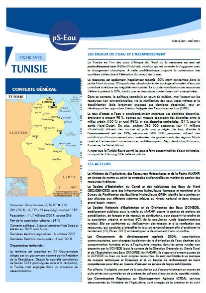 Cette fiche constitue une synthèse du contexte vis-à-vis de l'eau et l'assainissement en Tunisie, présentant les chiffres clés, les principales problématiques, le cadre règlementaires et les institutions, les mode de gestion des services, ainsi que quelques projets de coopération en cours.