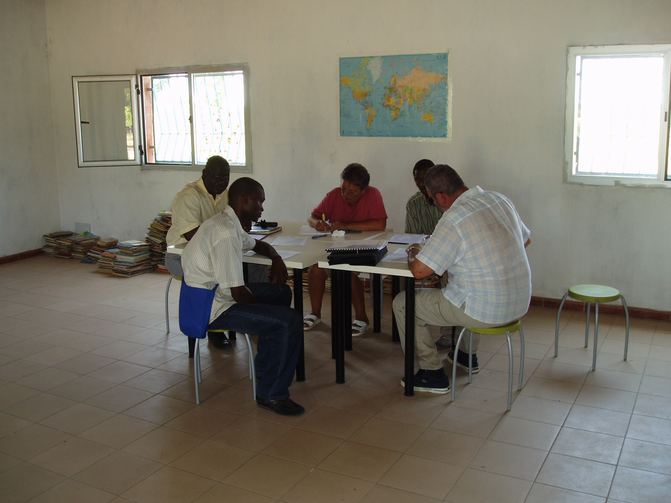 Réunion de réception des travaux par les différents partenaires (© Vivre en brousse) Fin octobre, le Responsable du pôle intervention de la SEMERAP, pour la partie hydraulique, accompagné d’un Responsable de DEKRA-NORISKO pour la partie électrique et sécurité, réceptionnent l’installation en présence des représentants des entreprises HICS (© Vivre en brousse)