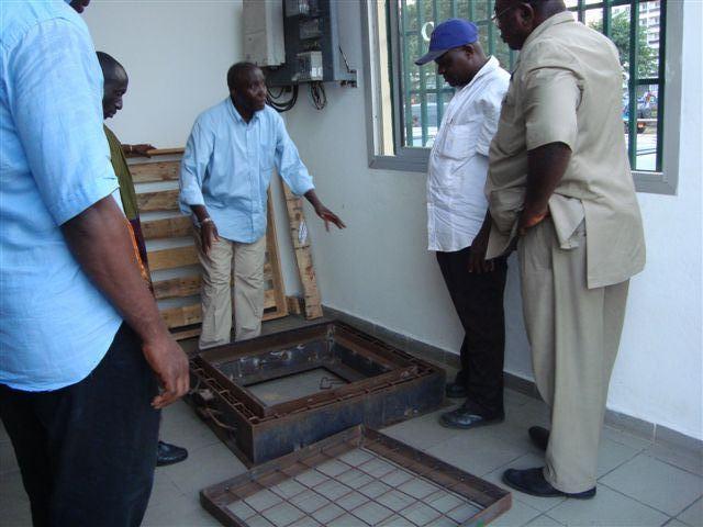 Formation des maçons locaux à l'utilisation des moules pour la fabrication des regards (© Enda)