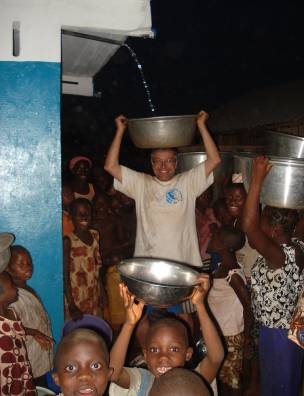 Borne fontaine à Tado (©photo: aquassistance) Un intervenant Aquassistance et des enfants à une nouvelle borne fontaine à Tado à la mise en route du réseau en mai 2008.