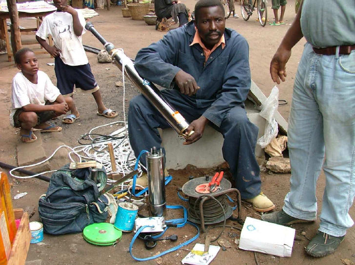Vue de la pompe électrique qui va équiper le forage: le moteur est par terre avec son cable bleu d'alimentation électrique; le corps de pompe est dans les mains du technicien.(©photo: ASDVT)