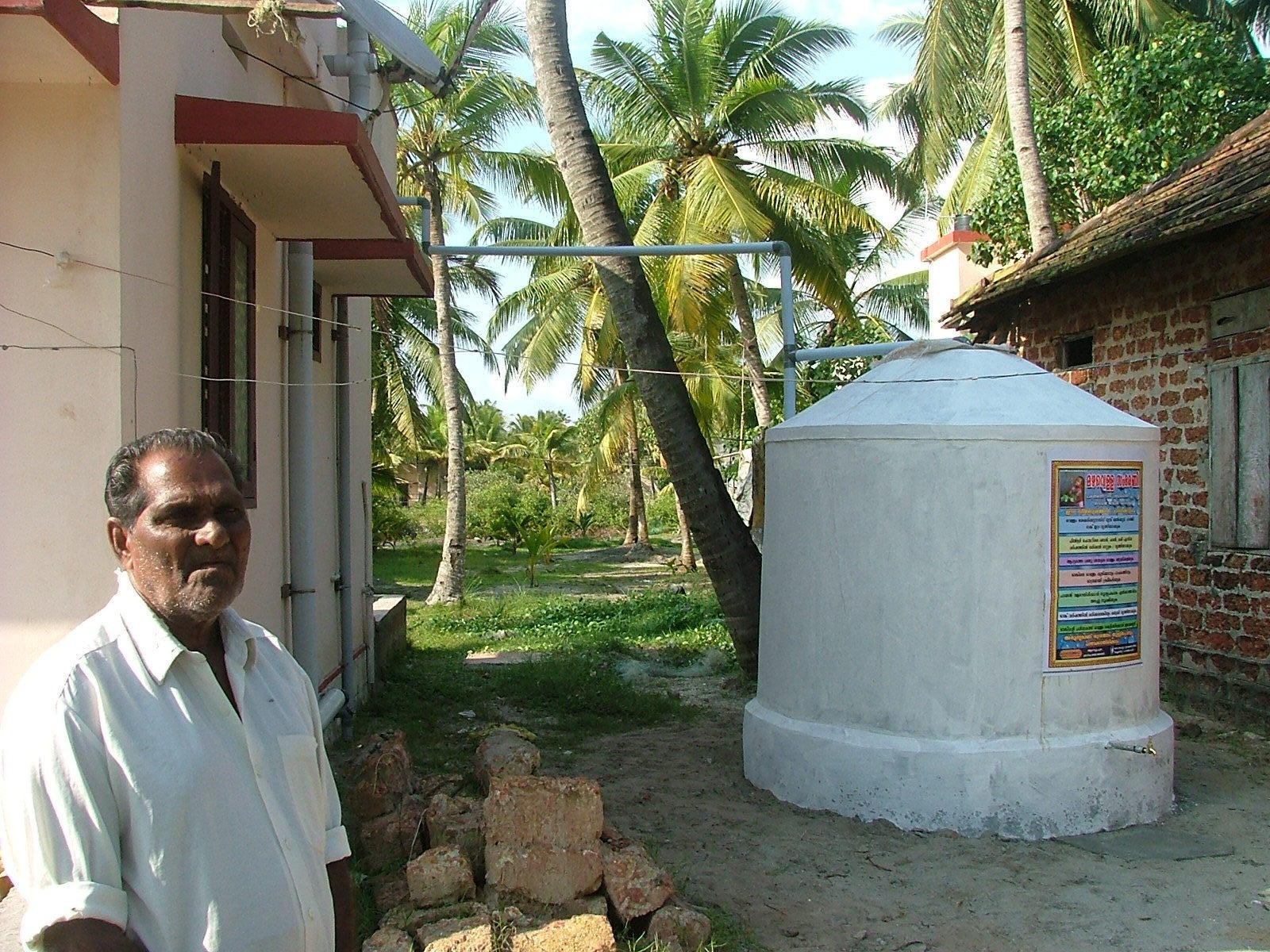 Réservoir de récupération d'eau de pluie.(©photo: Areed) Canalisation depuis la toiture et réservoir de récupération d'eau de pluie.(©photo: Areed)