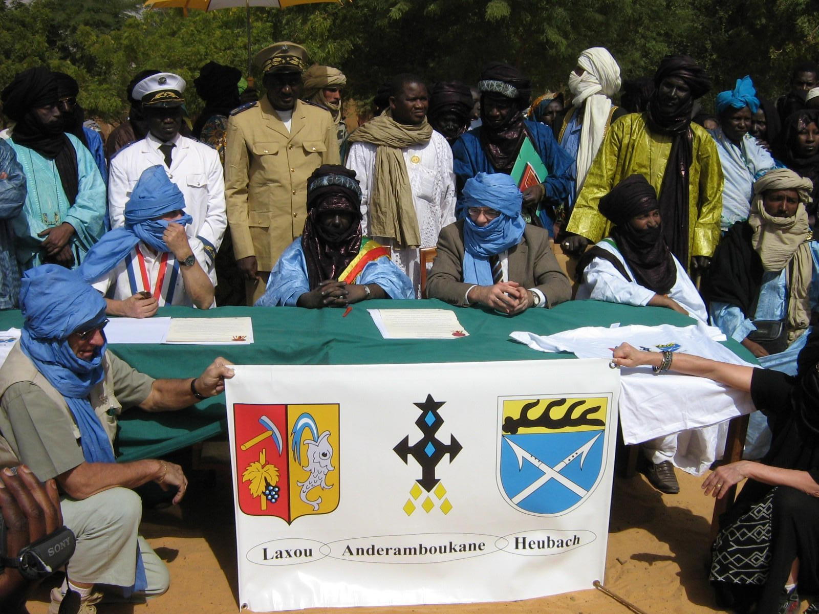 Les notables et représentants du jumelage Laxou/Anderamboukane/Heubach lors de l'inauguration: à table: le maire de Laxou, le maire d'Andéramboukane, le maire d'Heubach, le maire de Tillia. Au second plan, le sous-préfet, le préfet, le président de l'Association des Maires du Mali. Au premier plan, le président du Comité de jumelage.(©photo ACJL Laxou)