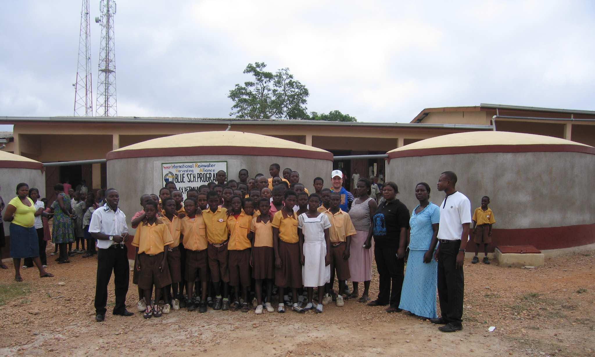 Les élèves d'une classe d'Awiankwanta devant les nouveaux réservoirs d'eau de pluie de leur école (@Irha)