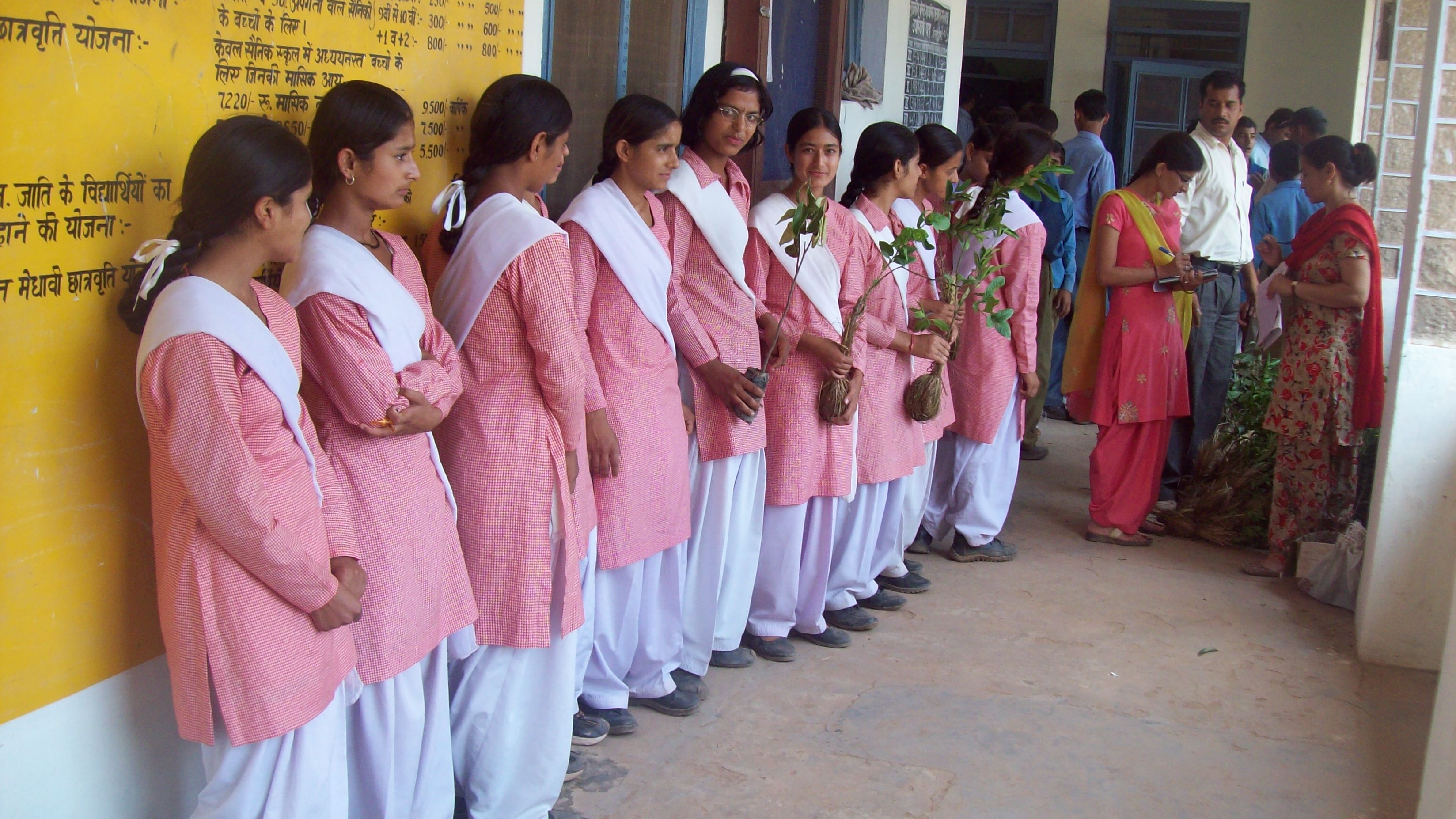 Distribution d’une pousse d’arbre aux enfants pour la planter dans leur maison (initiative « un enfant un arbre »), ici à l’école de Galanaghat