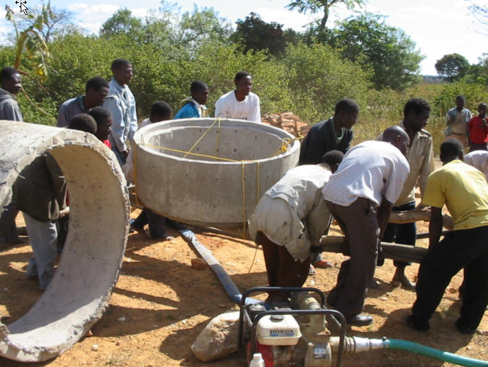 Equipe de personnes manoeuvrant une des buses afin de la mettre en place au dessus de l'ouverture du puits (©photo: Inter Aide/Essor)