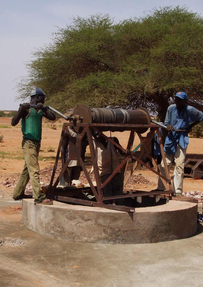 Deux puisatiers à la manoeuvre du treuil pour remonter les matériaux, qu'un troisième puisatier dégage en fond de puits. (©photo: Areed)